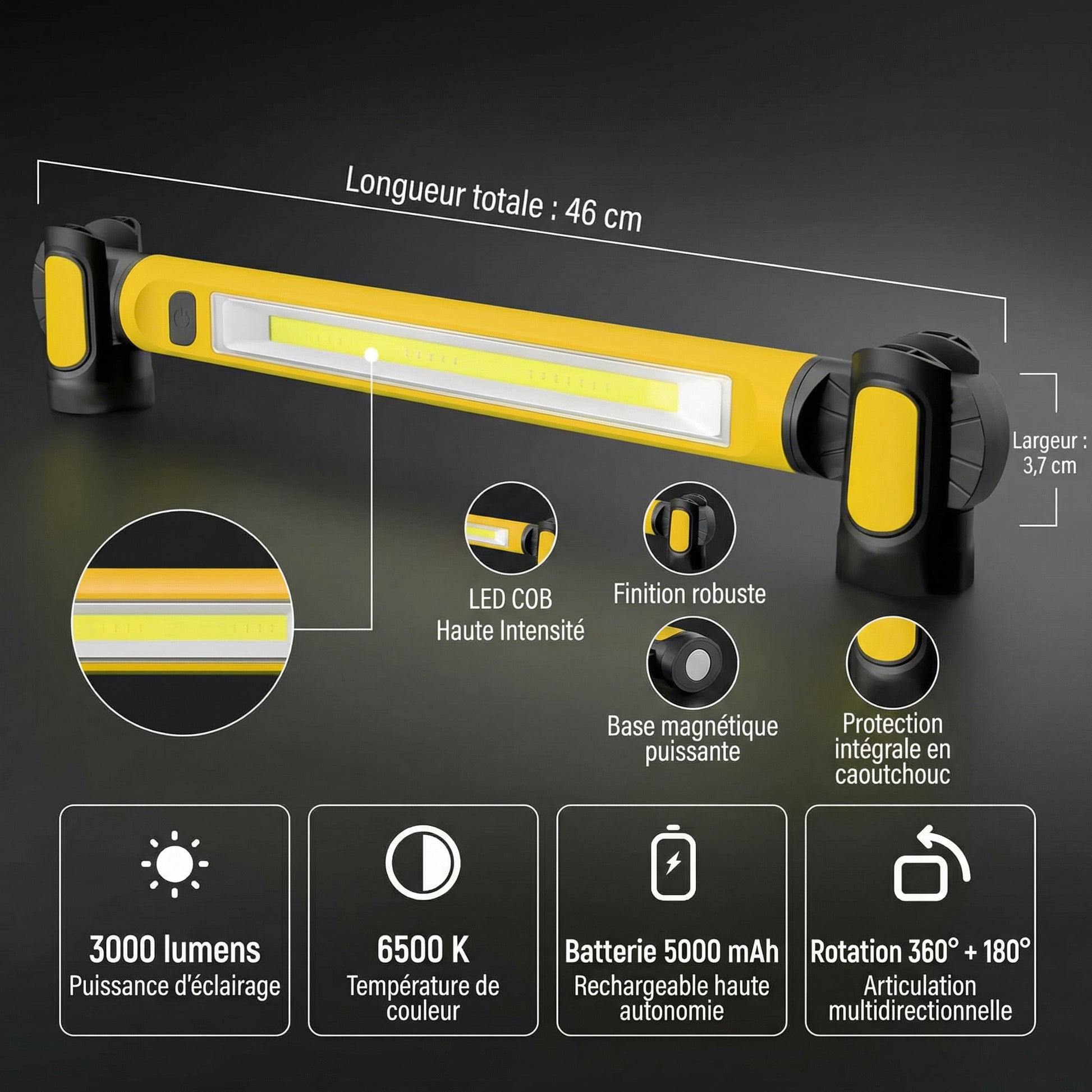 Grâce à sa fixation magnétique puissante et son éclairage haute intensité, votre espace est parfaitement illuminé et vos mains restent libres.